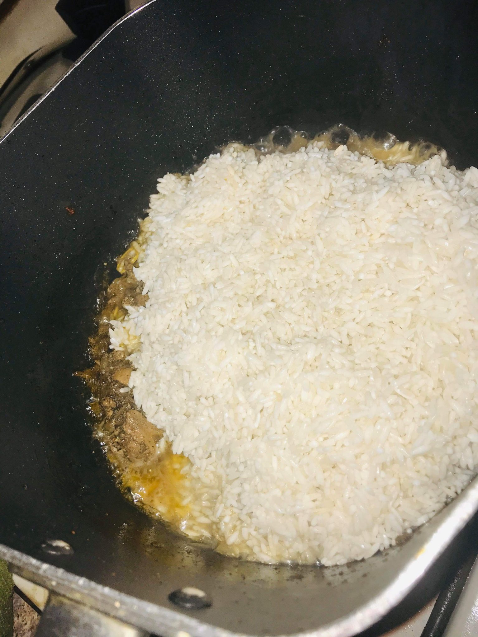 - ثم نضيف الأرز المغسول او المنقوع ونضيف الملح