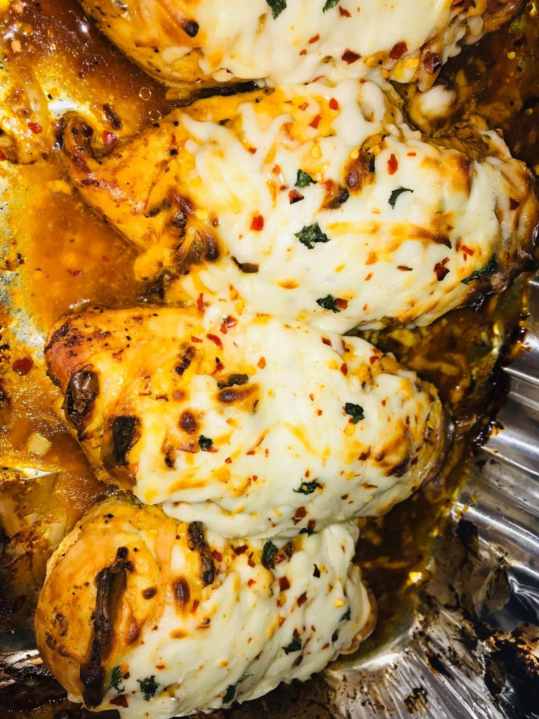 نخرج الدجاج من الفرن ونقوم بوضع الجبنة الموتزاريلا والنعناع والفلفل الاحمر المجفف علي وجه الدجاج وندخله مرة اخري الي الفرن وتشغل الشواية ،حتي يذوب الجبن ويكتسب لون ذهبي خفيف وبالهنا 😍😋
