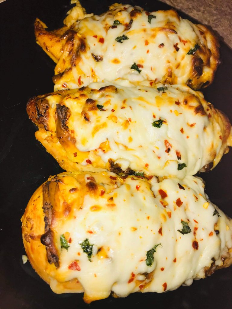نخرج الدجاج من الفرن ونقوم بوضع الجبنة الموتزاريلا والنعناع والفلفل الاحمر المجفف علي وجه الدجاج وندخله مرة اخري الي الفرن وتشغل الشواية ،حتي يذوب الجبن ويكتسب لون ذهبي خفيف وبالهنا 😍😋